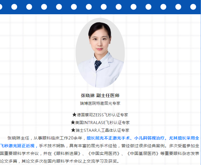 如果您想要一個(gè)更好的專(zhuān)家為您做近視手術(shù),那么您也可以到瑞博眼科,由上海專(zhuān)家張曉琳為您會(huì)診手術(shù)。